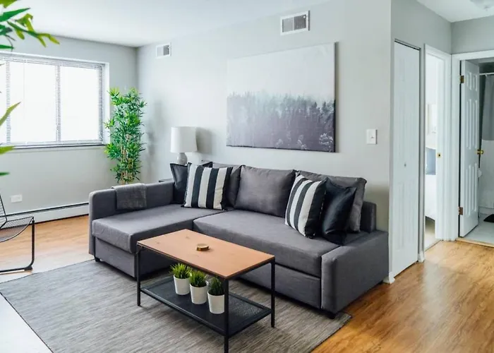 Ogni camera di quest'appartamento include una cucina completamente attrezzata con una lavastoviglie e un forno. Ci vogliono 26 minuti d'auto per andare all'aeroporto Internazionale di Chicago O'Hare.